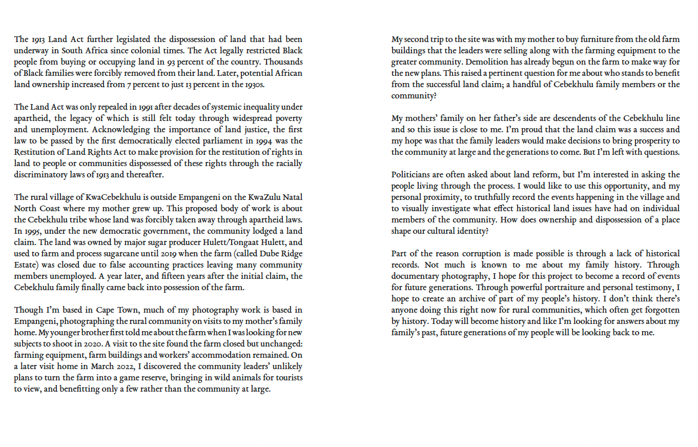 Bittersweet - Land Claims and Community Narratives – Documenting land claim issues and community development through portraiture and documentary photography in rural Empangeni, KwaZulu-Natal.